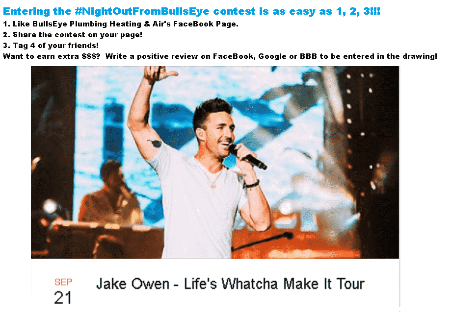 Read MoreOur contest this month is a bit different but AWESOME!#NightOutFromBullsEyeIn return for a few moments of your time: Anyone that likes AND shares the contest and tags 4 of your friends will be entered into the drawing for the upcoming Jake Owen, Chris Janson and Jordan Davis concert at Security Service Field on September 21st…